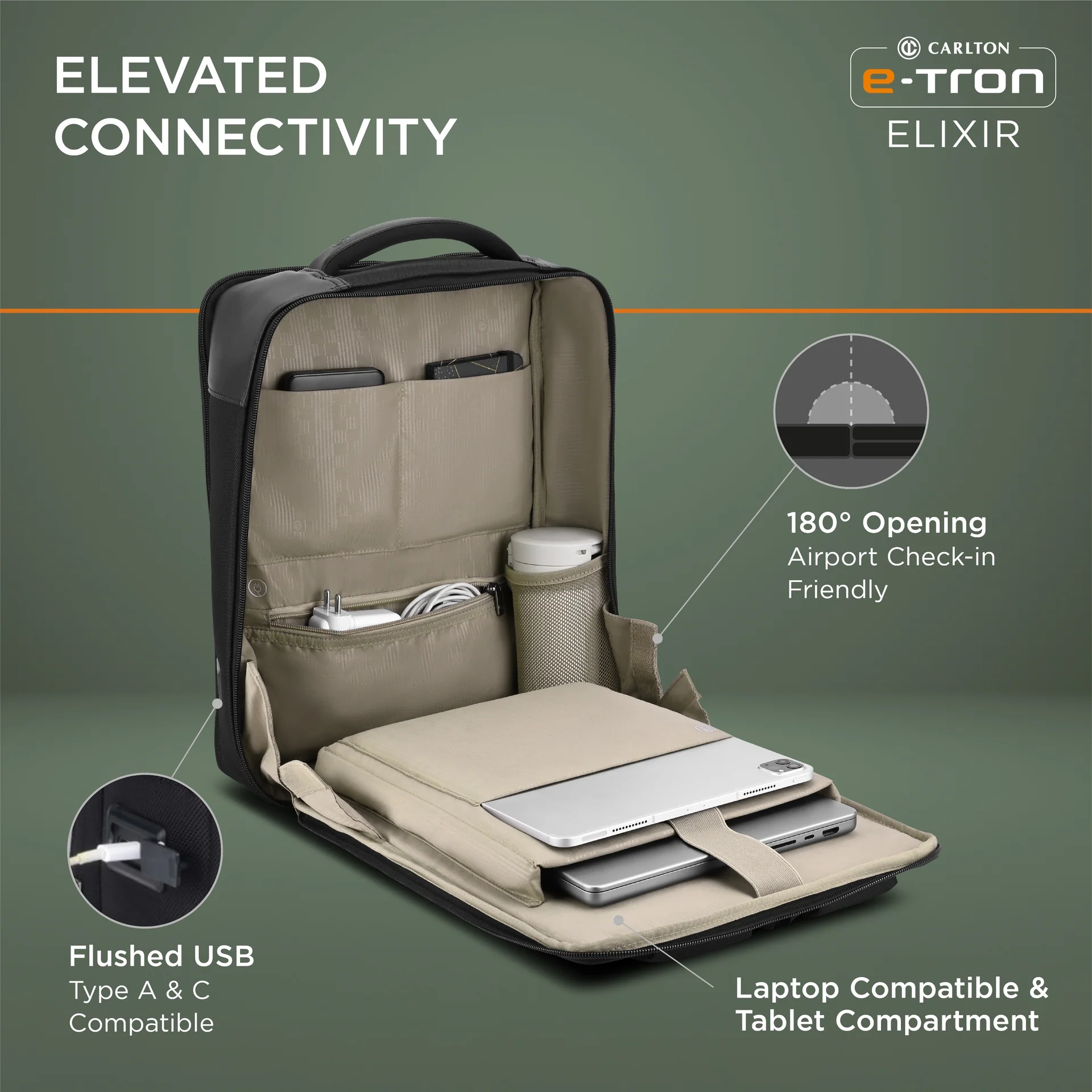 E-LEVATED CONNECTIVITY: Stay effortlessly connected with flush USB Type-A & Type-C ports and dedicated compartments for your laptop and tablet.