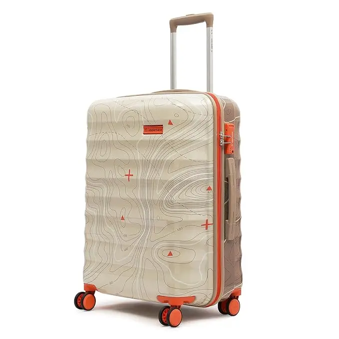 Elevate your travel experience with our topographic pattern suitcase, designed for both style and durability. Featuring a unique topographic print on a rugged hard shell, this suitcase stands out in any terminal while protecting your belongings. Vibrant orange accents add a pop of color, and 360-degree spinner wheels ensure effortless movement on any surface. Available in medium and large sizes, this suitcase comes with a telescopic handle, interior organization compartments, and TSA-approved locks for ultimate convenience and security. Make a statement wherever you go with this eye-catching travel essential.