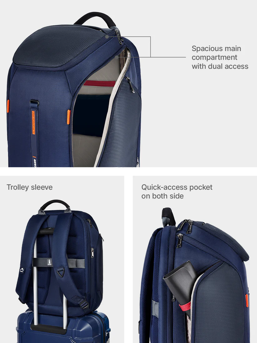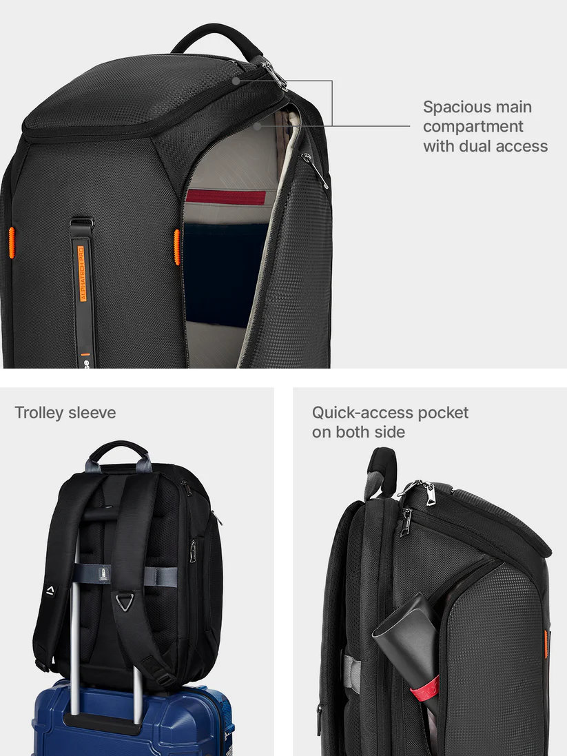 6 external pockets, including 3 quick-access, 2 passport/wallet slots, and a hidden bottle pocket, keep essentials neatly organized. Water-resistant fabric, trolley sleeve, and dedicated tech pouch make this backpack ideal for daily commute or travel.