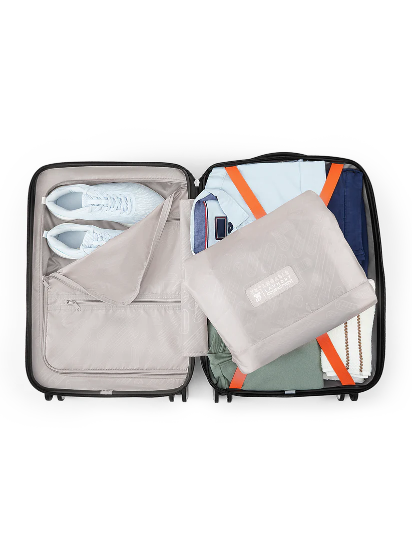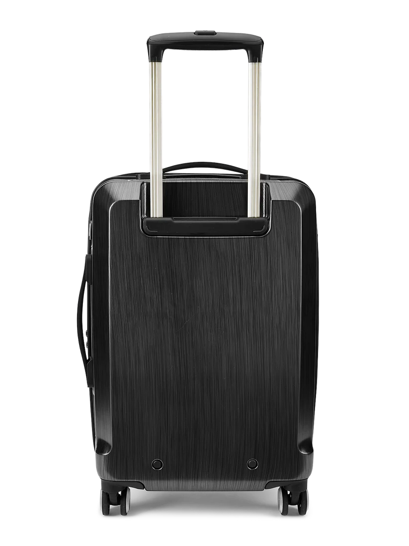 Includes a detachable laundry compartment and a separate toiletry pouch for neat packing. Premium push-button trolley and smooth double wheels ensure hassle-free movement at airports.Sleek, textured shell designed for strength, style, and everyday travel convenience.